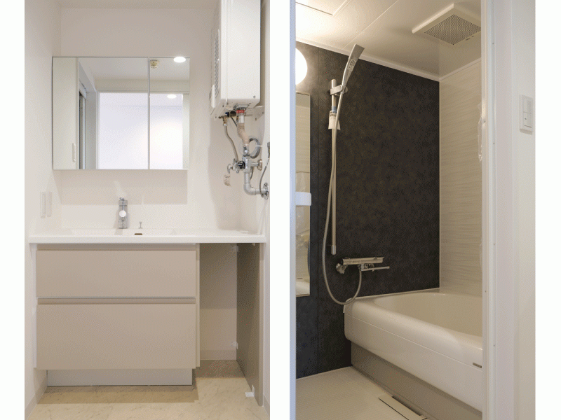 スッキリシンプルな洗面台。右下はオープンスペースになっているので様々な使い方ができます。ユニットバスはトクラス製です。