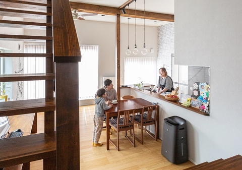 地下鉄駅まで徒歩12分ほどとアクセスのいい場所で見つけた築40年の家をお気に入りのブルックリンスタイルにリノベーション。一番のポイントはリビングにカッコよく映えるアイアンの階段。あわせてダイニングの照明、天井で回るプロペラファン、そして室内窓のフレームも同じマットな黒のアイアンで揃えました。さらに2階天井と1階のTVボード背面の壁には羽目板を貼り、キッチンのタイル壁も貼り方を指定して、こだわりのスタイルに。使い込むほどに味わいが増す革張りのソファの似合う素敵な我が家になりました。