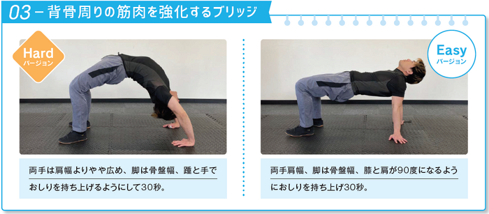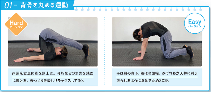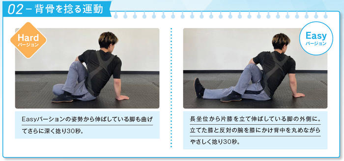 今回は背骨の柔軟性と丈夫さを上げるための簡単なエクササイズを普段運動されない方向けのEasyバージョンと運動に慣れている方向けのHardバージョンに分けご紹介致します。