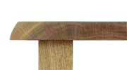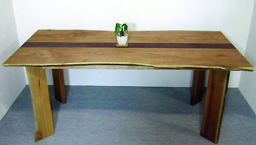 食卓テーブルの場合、80㎝前後の奥行が必要ですが、その巾が取れる木は、樹齢数百年の希少な木です。一般的には、3枚〜5枚の板を、巾方向に接いで80㎝の奥行に仕上げます。接ぎ合わせる際、木目が自然に見えるよう、まんなかの一枚を板目に、両側の2枚は、柾目に接ぎ合わせると、自然な木目に仕上がります。更に、同じ木(共木)を使うと、一枚板のようにきれいな天板に仕上がります。また、全く違う種類の木を巾接ぎしてツートンのデザインにしたり、(参考写真ウォールナットと胡桃のテーブル)2枚の板を接いで、接ぎ位置を、斜め接ぎにすると、自然味溢れる印象的なテーブルになります。(参考写真天然面付楢共木テーブル)
