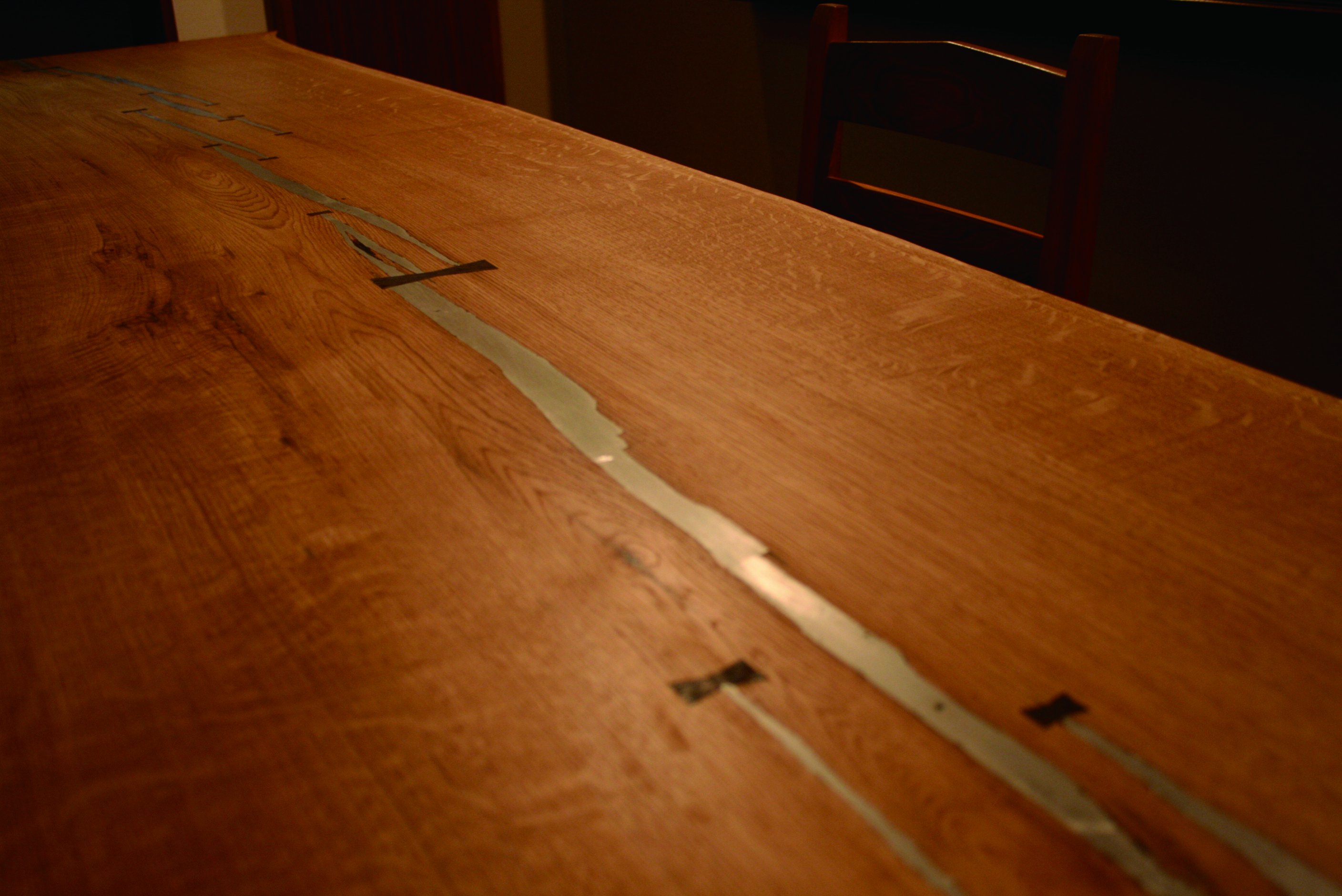 無垢材に、節や割れはつきものです。木材業界では、節のない無節を上等品として扱いますが、節は、木の枝が出る部分で、たくさんの枝葉を伸ばし、成長する木は、節があるのが自然です。ちょっと節がある方が、自然な感じで好まれます。節があっても強度は、変わりありませんし、通常は、節の状態により、手を加えて、長く使えるよう、仕上げます。無垢材は、割れがあることもあります。割れたところは、隙間に木をはさみ、木の粉に糊を混ぜて、埋めるのが一般的です。割れたままに仕上げる場合や、割れ止めのチギリだけを施すこともあります。割れたままの仕上げは、自然の表情を楽しみたい方にはオススメです。少し凝った方法では、割れ部分に錫(すず)を流し込み、割れ止めのチギリを施します。自然にできた割れの形に沿って、鈍く光る銀色と木の質感は、存在感があり、モダンなデザインになります。