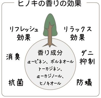 ヒノキの香りにはリラックス効果やリフレッシュ効果など森林浴のような効果があるそうです。防虫・抗菌作用のある成分も含まれていて、ダニの繁殖を抑制する効果もあるそうです。