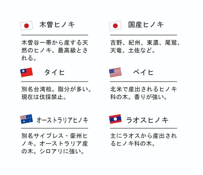 ヒノキといえば木曽地域から裏木曽地域(飛騨南部、東濃地域)に産する木曽ヒノキが有名です。日本には各地にヒノキの産地があり、吉野ヒノキ、紀州ヒノキ、東濃ヒノキ、尾鷲ヒノキ、天竜ヒノキ、土佐ヒノキなどがあります。