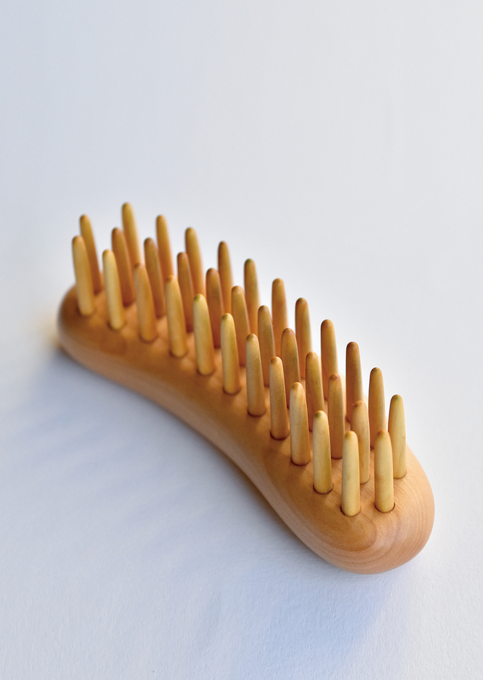 現在ではヘアブラシはプラスティック製が主流です。水にぬれても多少雑に扱ってもプラスティック製なら丈夫です。ツゲの木で手作りされたヘアブラシは使ってみると他の素材とは違う魅力があります。手になじむさらさらした感触や適度な弾力や硬さ、ぬくもりがここち良く心が落ち着きます。毎日使うもの、目にするものこそ自然の素材を取り入れると、いつもの日常が少し豊かに過ごせるように思います。