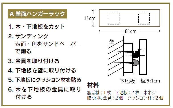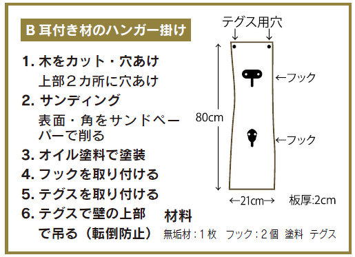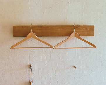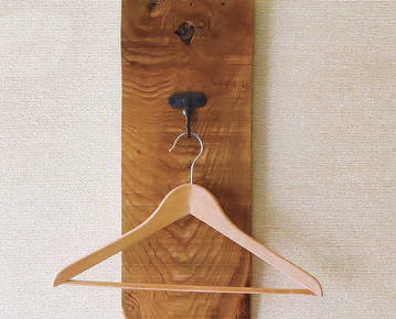 無垢材で作るハンガーラックは好みの木で作れます。面白い木目の木や節がある木でも良く、耳付き材も野趣あふれる雰囲気になりオススメです。「耳付き材」とは、木の外皮を剥いで丸太のボコボコした輪郭を残した木の事。