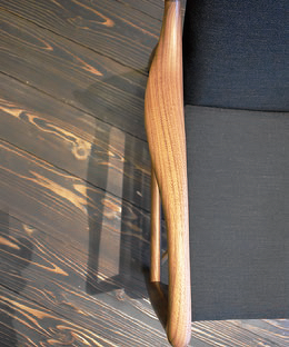 ほっそりとしている椅子の肘掛けと脚は、無垢材のブラックウォールナットを使用しています。立体的な彫刻作品のような3D 曲線に削り仕上げたデザインが印象的です。手に自然と馴染む肘掛けの形と細さが絶妙で、触れると木材ならではのぬくもりを感じます。木目も色も綺麗に揃っていて、一本の木から製材して天然木ならではの色のバラツキを抑えて均等に仕上げているそうです。「この椅子の木部は丁寧にオイル塗装で仕上げていますので使い込むほどに艶が出てきますよ。」と、この展示を企画した須藤修さん。しっとりと仕上げられた肘掛けは思わず腕を滑らせたくなります。この椅子はデンマークの建築家で家具デザイナーのフィン・ユール氏により、80年前にデザインされた45CHAIR です。今でも世界中にファンがいるそうです。