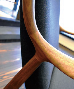 椅子をじっくりと見ると木の接合部分は精密で繊細なデザインの為に極限まで研ぎ出されていて木工技術の高さが伺えます。「このディティールを実現するために実は日本の木工技術が関わっています。この椅子は北欧でデザインされ、山形県の木工所で制作しています。」デンマークと日本のコラボレーションにより完成している事を知り、改めて繊細な