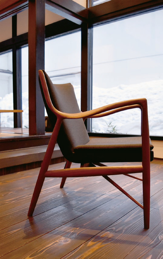 先日も座り心地のよい椅子を見つけました。その椅子は、築350年の長い歴史を刻んだ旅館の中にありました。太い柱や梁が印象的な山形座瀧波です。ゆったりと広い板張りの床