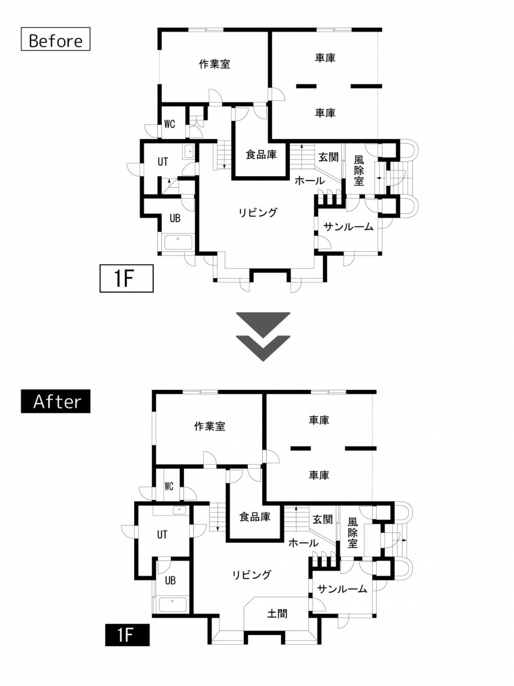 T邸のリノベーションは、ご主人とアルティザン建築工房がそれぞれに〝つくる〞範囲を細かく打ち合わせることから始まりました。建物の状態を調べるインスペクションも行い、構造は補強不要と確認。間取りは2階の天井を取り払って屋根裏のロフトスペースを設ける以外は、既存を活用しています。