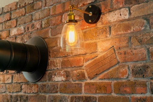 薪ストーブの趣を高めるレンガ壁、林の風景