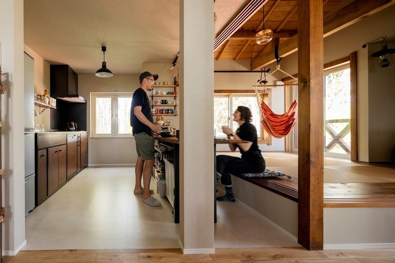 リノベーションでは、2階の和室を奥さまのリクエストに沿って古民家風に仕上げることに。掘りごたつにもできる畳スペースを板の間で囲み、市松に組んだ琉球畳はやや渋めの色を選択、床板は使い込むほどに味わいが増す濃いめの色で塗装してもらいました。さらに目線を上げれば、野地板と垂木がそのまま現れた天井や、ロフトとの境に配した格子が風情のある面持ち。「今すぐは無理だけれど、いつか京都から古い建具を取り寄せて入れたいと思っています」と奥さま。その時が訪れるのを待つかのように、以前あった壁をなくしてオープンに開放したキッチン側と廊下側には、しっかりと溝が切られた敷居と鴨居が設けられています。