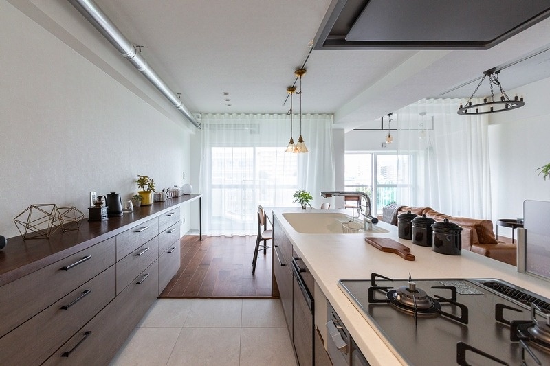 北王では、年間に3~4件のマンション・リノベーションモデルルームを公開しています。今回ご紹介するのは人気の桑園地区にある築39年のマンション。建物自体が持つヴィンテージ感も活かしつつ、インダストリアルなテイストを部分的に採用し、シンプルかつ大人な雰囲気に仕上げています。全体がハードなインダストリアルではなく、要所にニュアンス程度に取り入れているのがポイントです。
