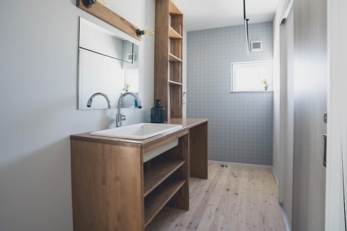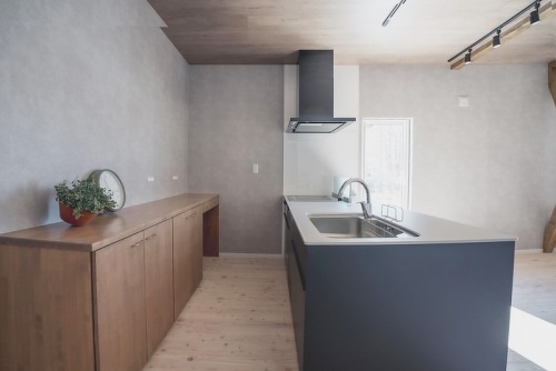 全体のインテリアカラーは、ブラック×グレー×木目の大人の落ち着いた雰囲気に。施主様お気に入りのキッチンの後ろには、いかすハウスの造作キャビネットを配置。