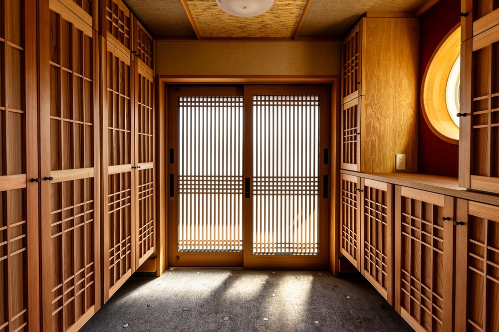 左手には丸窓。造作家具として下足棚もすべて造作しています。