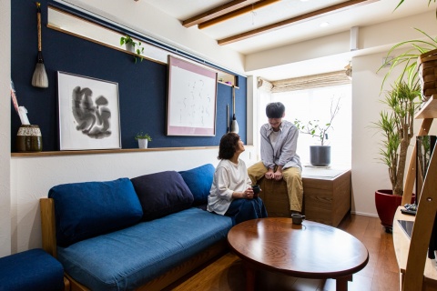ショールームに行くのも畳の色を決めるのも、一つひとつがすごく楽しかったですね。リビングのインテリアデザインは、わたしが気に入って先に買ってしまったソファの藍色を基本に考えてくださいました。いろいろアイデアを絞り、工夫していただいた造作家具も重宝に使えて、狭いながらも快適で掃除のしやすい家になりました。