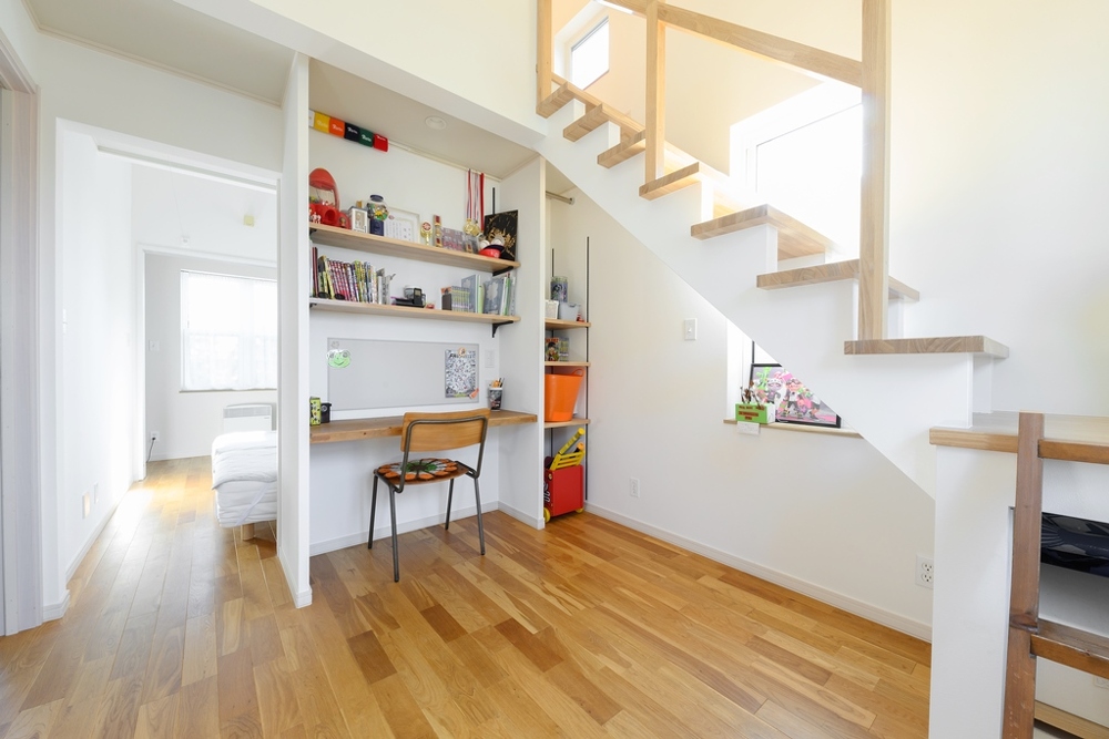 奥さま 寝室だった場所を長男の部屋にして、新しい2室は次男とわたしたちの寝室にしました。寝室横の細長い空間は棚をつくる予定でしたが、夫が「机にできるんじゃない」と話したことから主人のデスクスペースに。工事中の変更でしたが、すぐに対応してくれて、追加でかかる金額も明確に教えてくれたので、決断しやすかったですね。