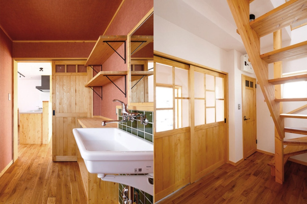 この家の一番のポイントは「ホームサウナ」を新設したこと。自宅に居ながら日常的に家族で「ととのう」体験を楽しめます。LDKでは既存の煙突を生かして薪ストーブを使うこともできます。