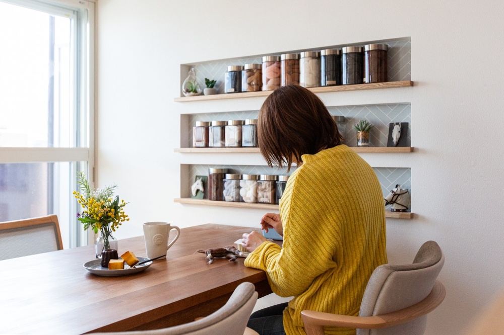 馬をモチーフにした奥さまのフェルト作品。カラフルで楽しい瓶入りの素材がダイニングを彩って
