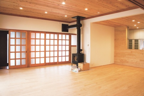 長年木に携わる仕事をしていた関係で、ひのき、栗、松、道南杉などの古材が家の随所に残っておりました。東商建設さんのご提案で、使える分を活かして、場所を変えたりしながらとっても素敵にリフォームしていただきました。築31年の寒さを感じていた縁側も、断熱施工のおかげでいまは裸足で座ることができます。ダイニングは掘りごたつにして、庭を眺めれるようにしました。今風の和モダンに変身した我が家で薪ストーブを焚きながらのんびりと暮らしています。